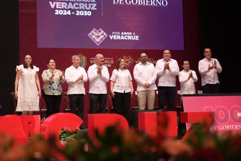 Coatzacoalcos, Ver., sábado 08 de marzo de 2025.- Ante un Centro de Convenciones y Teatro de la Ciudad abarrotado, la titular del Ejecutivo de Veracruz, Rocío Nahle García, presentó su Informe de los 100 Días de Gobierno, acompañada por su Gabinete legal, destacando logros en materia de infraestructura, desarrollo económico, seguridad y bienestar social.