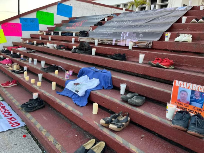Fue en el parque Independencia en donde al menos cuatro colectivos colocaron mantas con la imagen de sus desaparecidos, zapatos, tenis y zapatillas, así como prendas de vestir, cartulinas y veladoras para después orar.