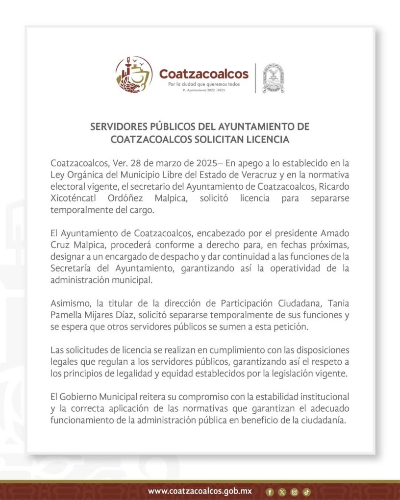 Coatzacoalcos, Ver.- En cumplimiento con la normativa electoral vigente y la Ley Orgánica del Municipio Libre del Estado de Veracruz, el secretario del Ayuntamiento de Coatzacoalcos, Ricardo Xicoténcatl Ordóñez Malpica, solicitó licencia temporal para separarse del cargo.