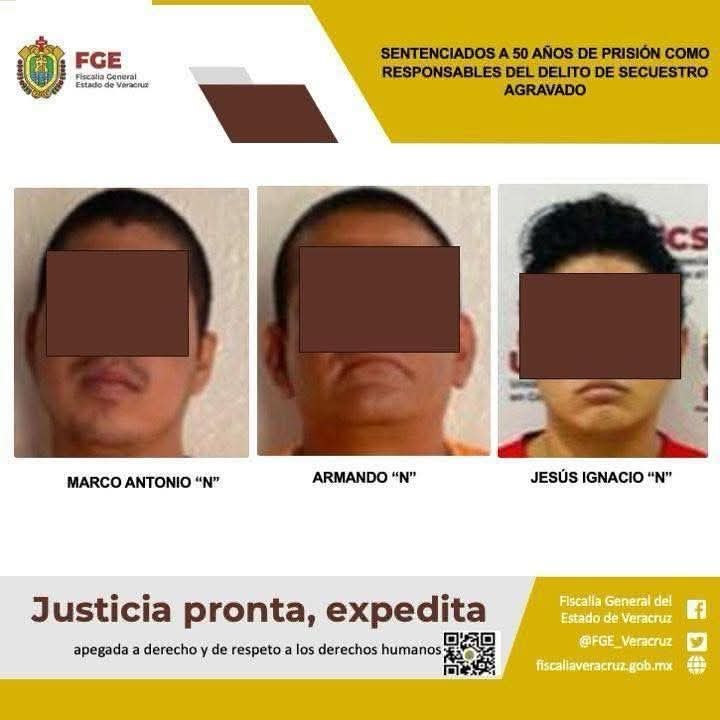 La Fiscalía General del Estado de Veracruz, a través de la Unidad Especializada en Combate al Secuestro, obtuvo una sentencia condenatoria de 50 años de prisión para Marco Antonio “N”, Armando “N” y Jesús Ignacio “N”, tras ser hallados culpables del delito de secuestro agravado, en perjuicio de un comerciante identificado con las iniciales A.M.D.Z.