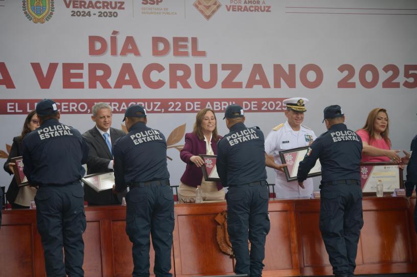 En el Centro de Estudios e Investigación en Seguridad (CEIS), acompañada por el titular de la SSP, Alfonso Reyes Garcés, e integrantes de la Mesa de Construcción de la Paz, otorgó reconocimientos a 76 elementos por su desempeño sobresaliente y vocación de servicio; diez de ellos, ganadores de los juegos deportivos celebrados por el Día del Policía Veracruzano.