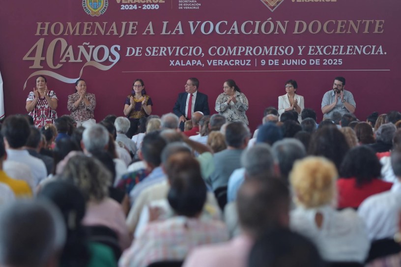 Xalapa,Ver. 09 de Junio de 2025.-En representación de la LXVII Legislatura del estado, la presidenta de la Mesa Directiva, diputada Tanya Carola Viveros Cházaro, acudió al acto organizado por el Gobierno del Estado, a través de la Secretaría de Educación de Veracruz (SEV), en reconocimiento a la vocación docente de alrededor de 60 personas y que cumplieron 40 años de servicio.Encabezaron este acto la titular de la SEV, Claudia Tello Espinosa, y el subsecretario de Gobierno, José Manuel Pozos Castro. Asistieron también líderes de organizaciones sindicales y docentes de la entidad.