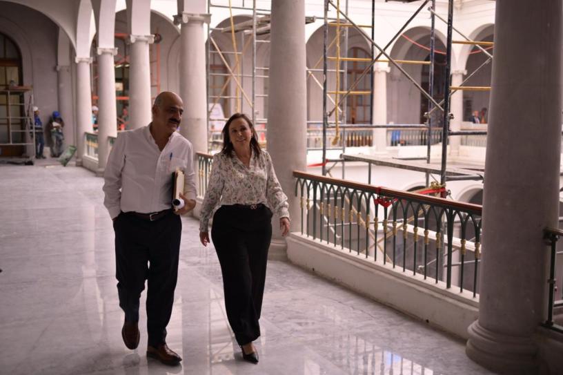 Xalapa, Ver., miércoles 13 de agosto de 2025.- La gobernadora Rocío Nahle García supervisó, junto con el secretario de Gobierno (Segob), Ricardo Ahued Bardahuil, la rehabilitación del Palacio de Gobierno, destacando que se trata de la primera intervención integral en más de 50 años.