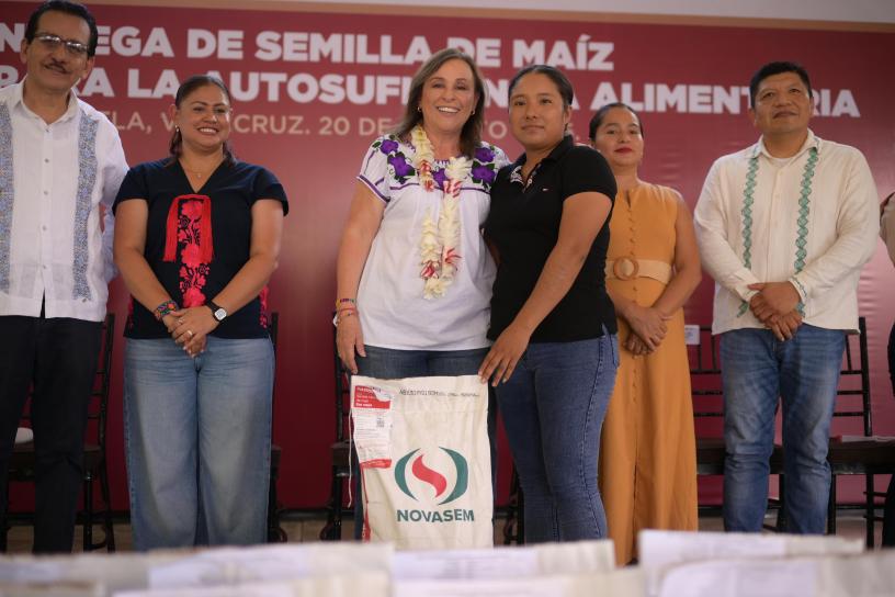 Papantla, Ver., miércoles 20 de agosto de 2025.- Desde la localidad de La Guásima, la gobernadora Rocío Nahle García encabezó la entrega de apoyos a más de 250 productoras y productores de maíz, quienes recibieron la variedad criolla mejorada Tuxpeño Hojero Chapingo para incrementar el rendimiento de sus cosechas y fortalecer la seguridad alimentaria, para reducir la importación