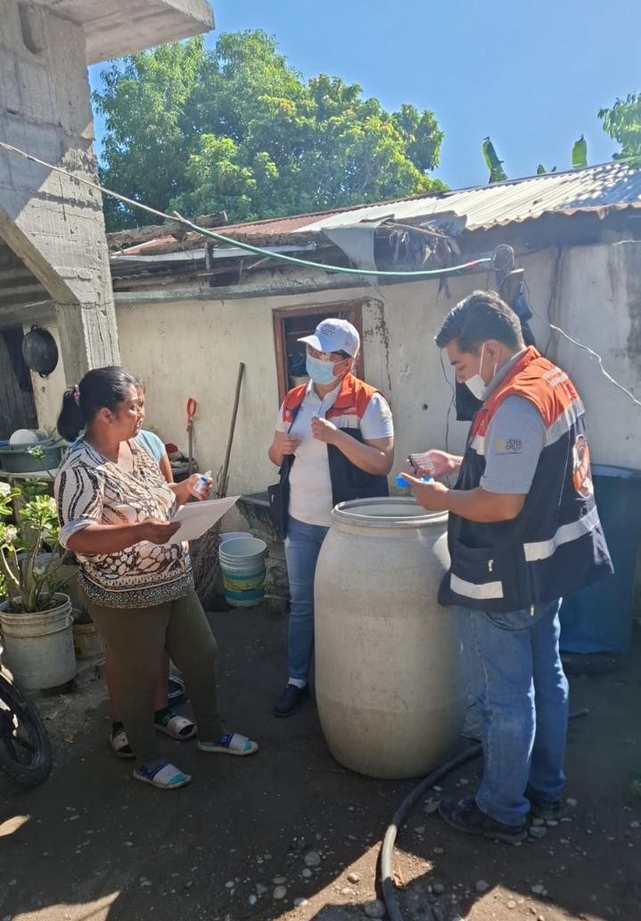 A través de la Dirección de Protección contra Riesgos Sanitarios y en coordinación con Regulación Sanitaria de la Jurisdicción Sanitaria I, casa por casa se distribuyeron unidades de hipoclorito de calcio y plata coloidal, además de informar a la población sobre las medidas para la correcta desinfección de alimentos y depósitos de agua.