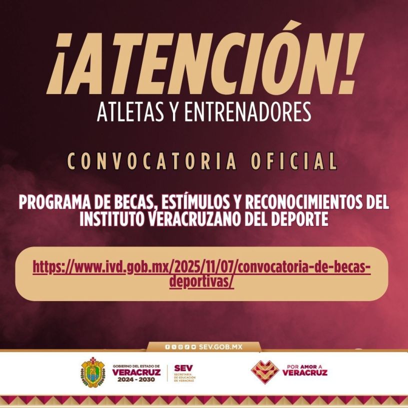 Veracruz, Ver., domingo 09 de noviembre 2025.- El Gobierno del Estado, a través del Instituto Veracruzano del Deporte (IVD), publica la Convocatoria del Programa de Becas Deportivas del periodo 2025-2026, dirigida a los atletas y entrenadores del deporte convencional y adaptado.