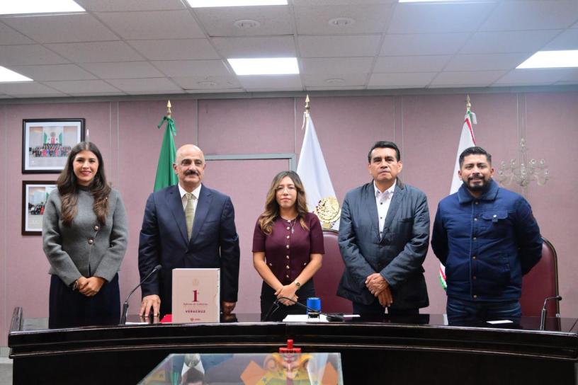 Xalapa, Ver., 15 de noviembre de 2025.- En representación de la LXVII Legislatura, la Mesa Directiva, presidida por la diputada Naomi Edith Gómez Santos, y el presidente de la Junta de Coordinación Política (Jucopo), diputado Esteban Bautista Hernández, recibieron del titular de la Secretaría de Gobierno (Segob) del estado, Ricardo Ahued Bardahuil, el Primer Informe de Gobierno de la administración encabezada por la ingeniera Rocío Nahle García.