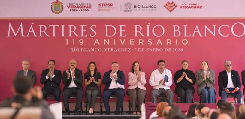 Río Blanco, Ver., miércoles 07 de enero de 2026.- Como cada año, con la participación de organizaciones sindicales, confederaciones obreras, trabajadoras y trabajadores, así como autoridades estatales y federales, la gobernadora Rocío Nahle García encabezó la Conmemoración del 119 Aniversario de los Mártires de Río Blanco, con la guardia de honor y un minuto de silencio ante su monumento.
