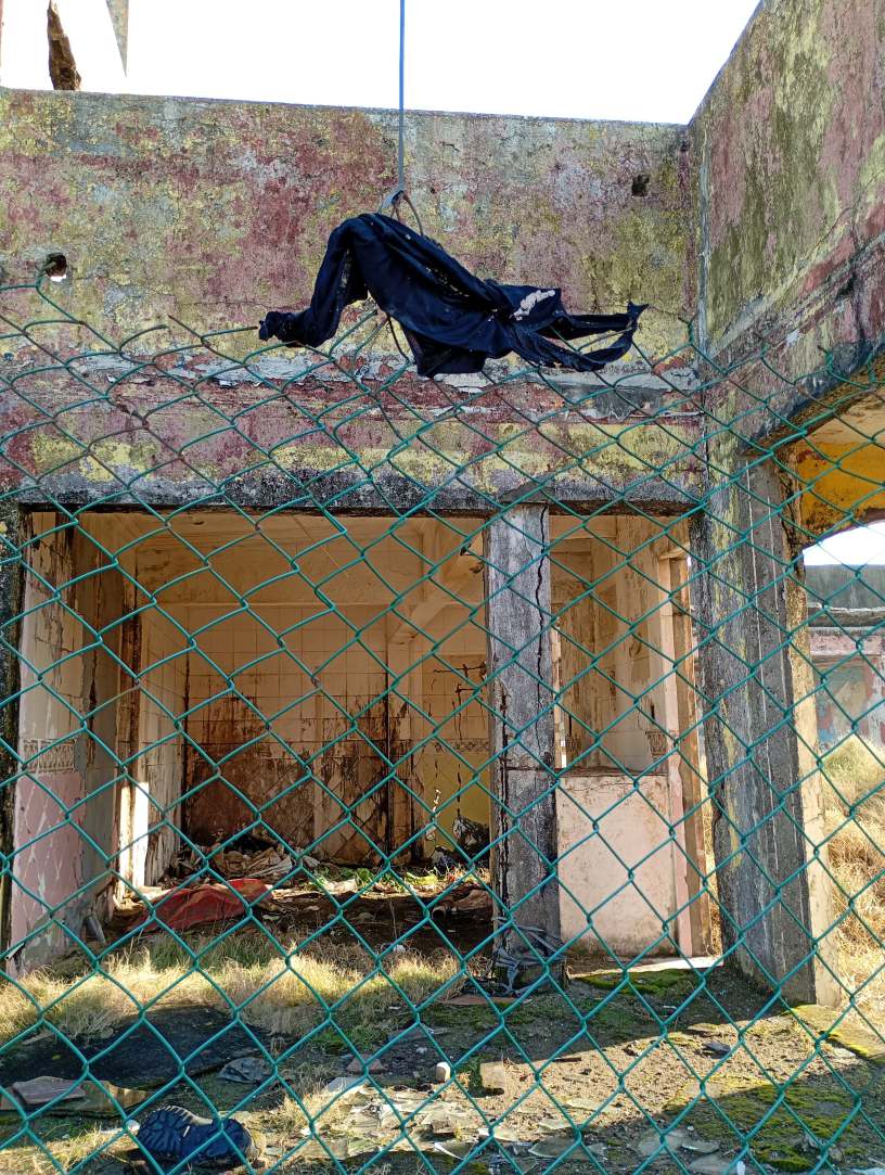 Más adelante, las ruinas de un hotel que en la década de los 80 prosperaba como destino turístico local ahora acumula desechos y es ocupada por un sujeto que pernocta en sus cuartos vacíos.