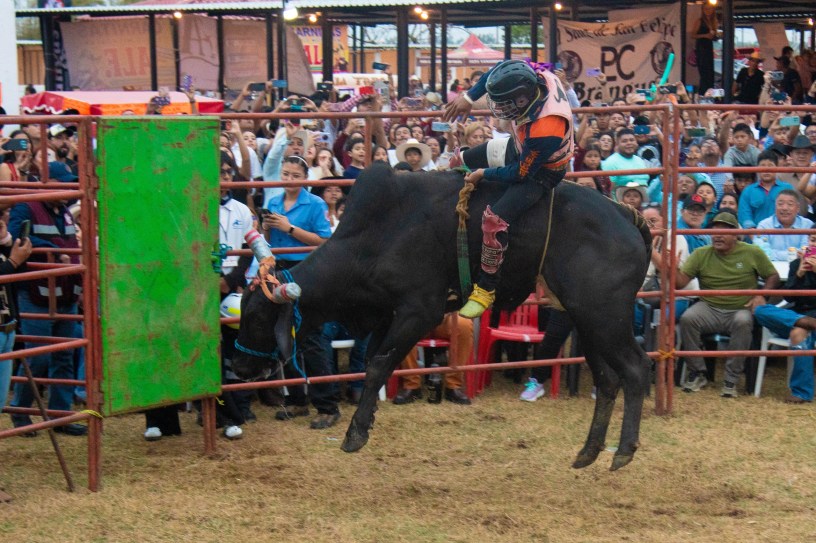 El espectáculo incluyó siete montas de jinetes profesionales de Tuxtepec, Oaxaca, así como toros del rancho La Victoria, del Cerro de Nanchital, ejemplares con genética de reparo.