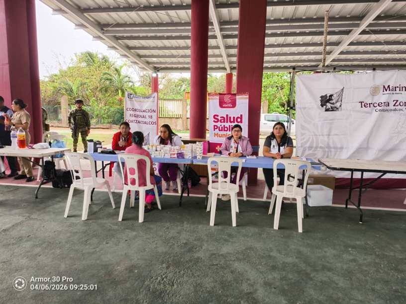 Coatzacoalcos, Ver., 6 de abril de 2026.- Este lunes dio inicio la Jornada de Atención Médica de Primer Contacto en la congregación de Barrillas, una estrategia integral que busca brindar servicios de salud y apoyo social tanto a quienes participan en las labores de limpieza por la arribazón de hidrocarburo en las costas del sur de Veracruz, como a la población en general.