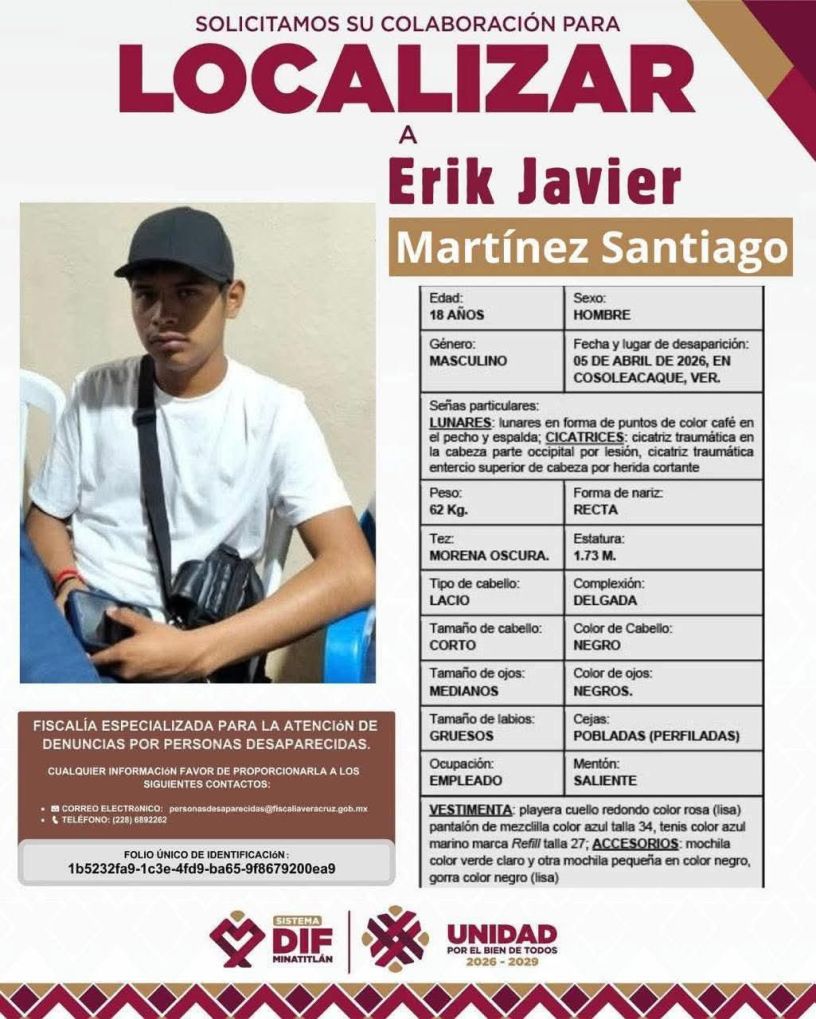 Coatzacoalcos, Ver; 13 de abril de 2026.-El Sistema DIF Coatzacoalcos se suma a la búsqueda de ERIK JAVIER MARTÍNEZ SANTIAGO, de 18 años de edad, que fue reportado desaparecido ante la Fiscalía Especializada para la Atención de Denuncias por Personas Desaparecidas (FEADPD), desde el pasado domingo 5 de abril de 2026 en el municipio de Cosoleacaque, Veracruz.