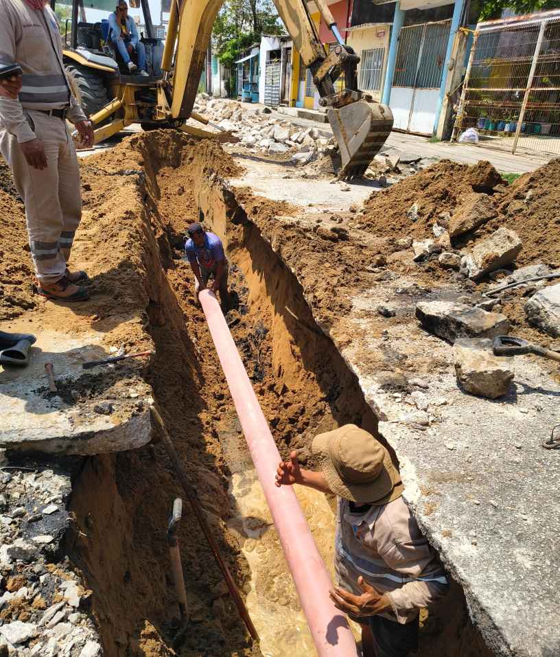 Como parte de las acciones, se realiza la sustitución de 36 metros lineales de tubería de 8 pulgadas y la reparación de más de 10 descargas sanitarias, lo que permitirá mejorar significativamente el funcionamiento del sistema sanitario en la zona.